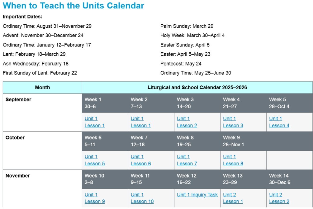 This year, Unit 2 starts during Week 13 (November 23–29), and Advent starts on November 30th. Check your When to Teach the Units Calendar on the Teacher Website!