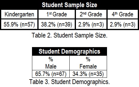 Data were submitted for 102 kindergarten through fourth grade students. Of the total group, 65.7% were male and 34.3% were female. Refer to Table 2 for a summary of the LLI student sample size by grade and refer to Table 3 for a summary of the student demographics.