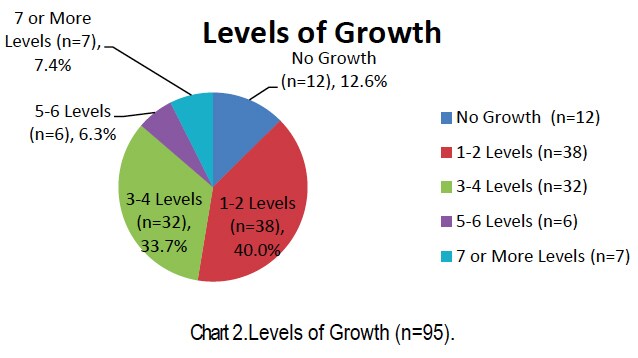 The instructional reading level gain for the LLI students is depicted in Chart 2 below. 47.4% of the LLI students demonstrated an instructional reading level at least three levels higher than their pre-LLI level and 7.4% raised their reading skills seven or more levels, which in all grades represents more than a year’s progress (see Chart 2).